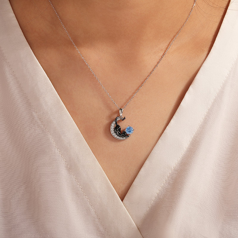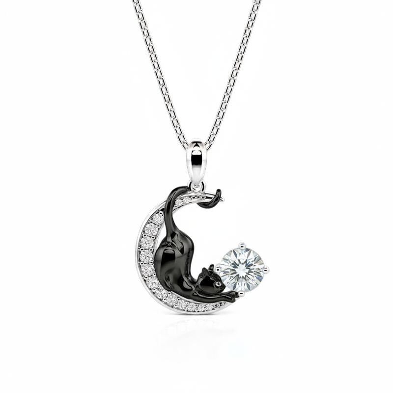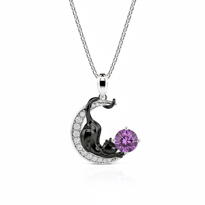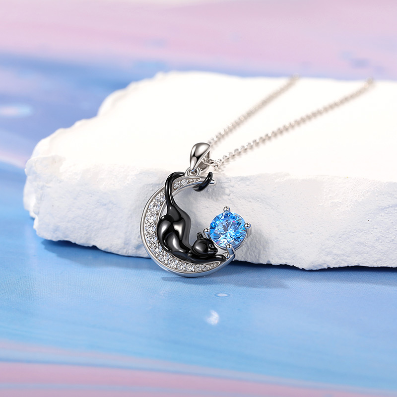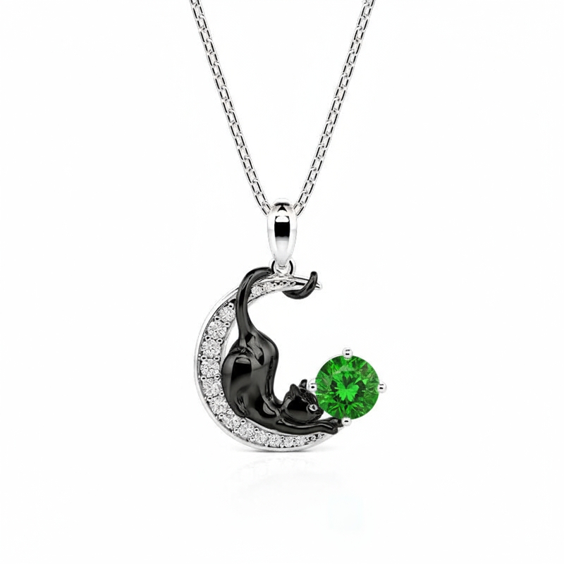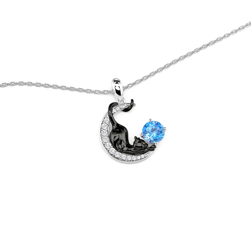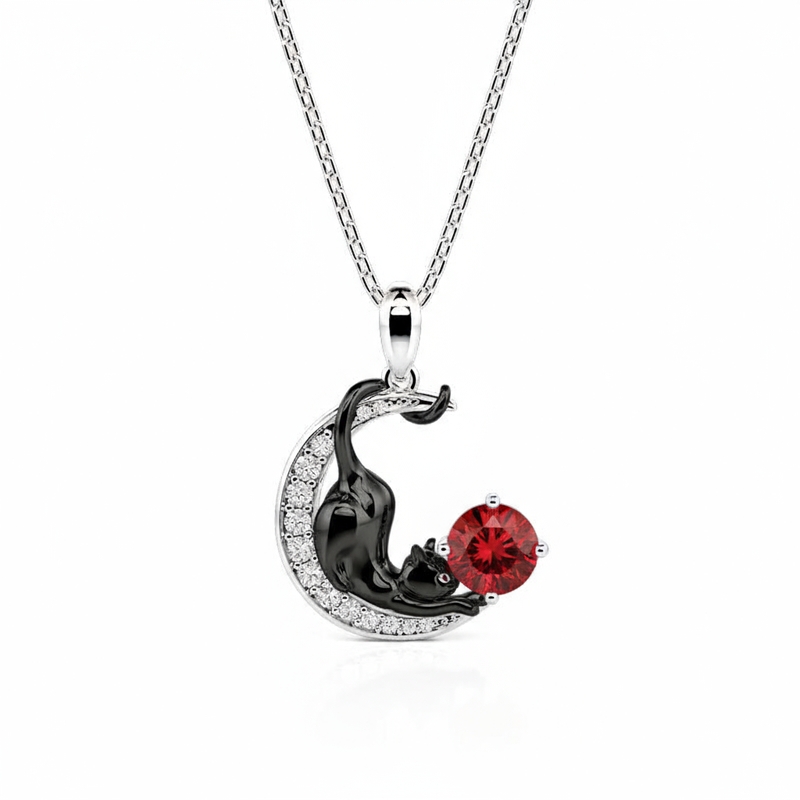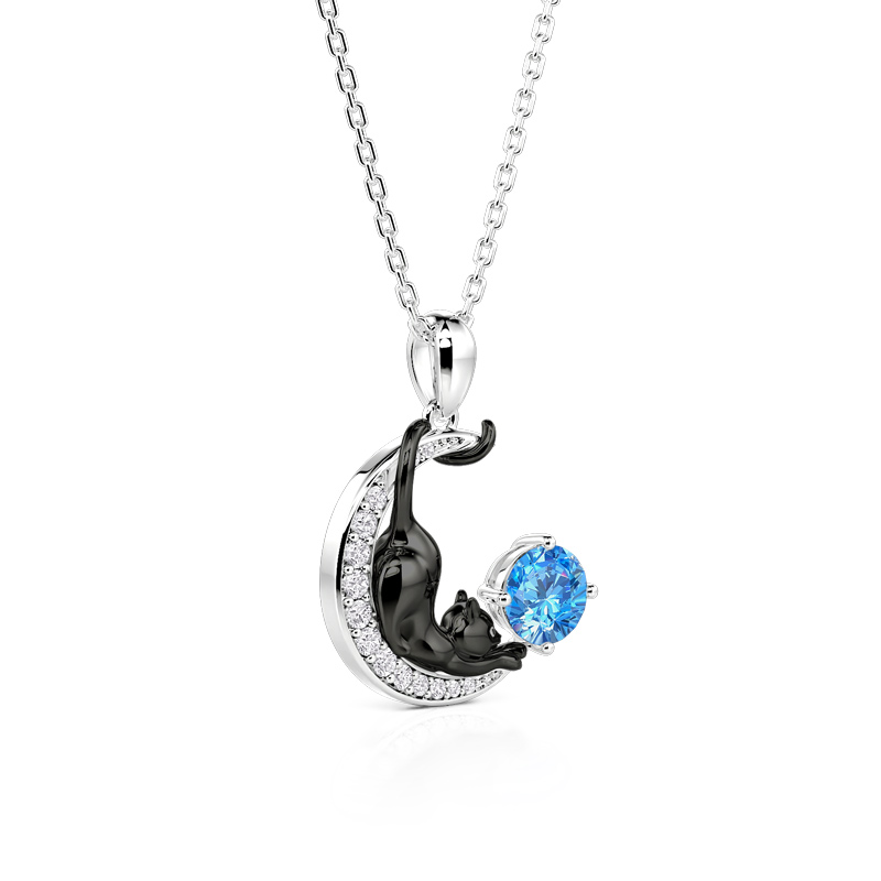 Jeulia Personlig Svart Katt Måne Halsband med Födelsesten