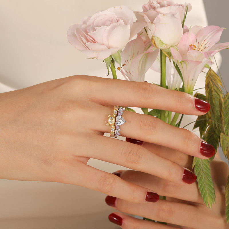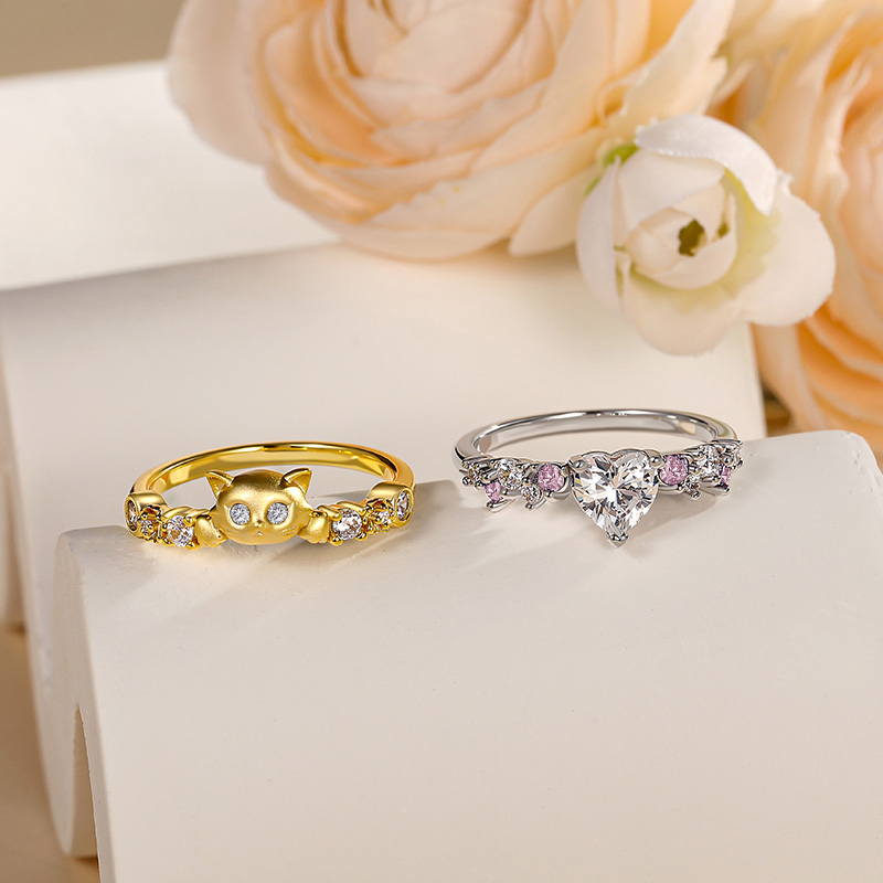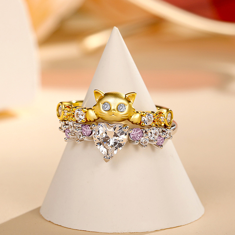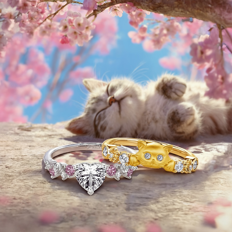 Jeulia Hug Me Sakura Cat Heart-ringsetten innehåller 2 silverringar. Huvudring: Ett forgylld kattansikte kikar genom utspridda sakurablad, varje blomma en frostad zirkon fryst mitt i fallet. Följeslagarring: En silverpulslinje av stenar snabbar mot en hjärtslipad sten — ditt hjärtslag kristalliserat. Stapla detta ringset: kattens tass verkar trycka på pulspunkten, animerar rytmen. Bär den solo för nyckfullhet (kattskurr) eller hängivenhet (hjärtslagets konstans). Inuti kattens öra: en mikrogrodd fiskben — din hemliga delade blinkning.