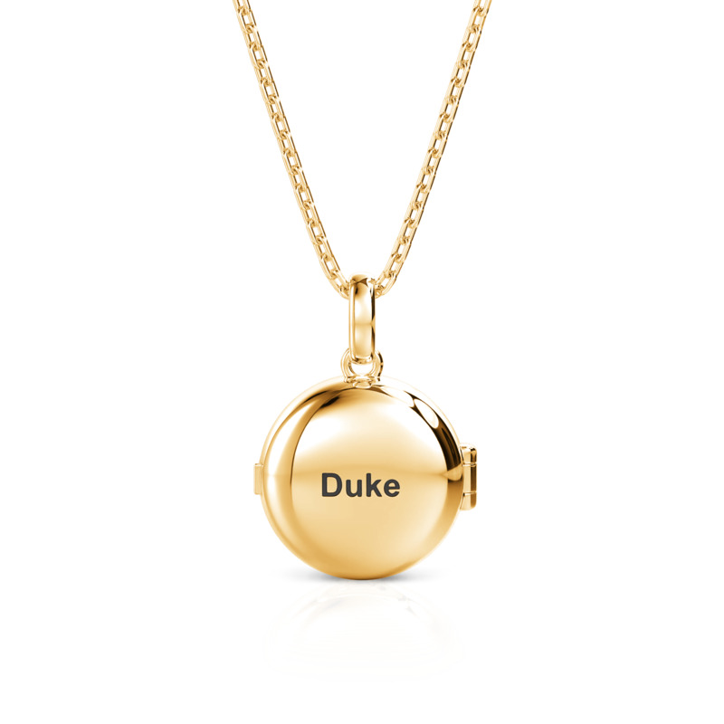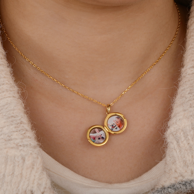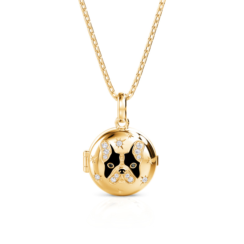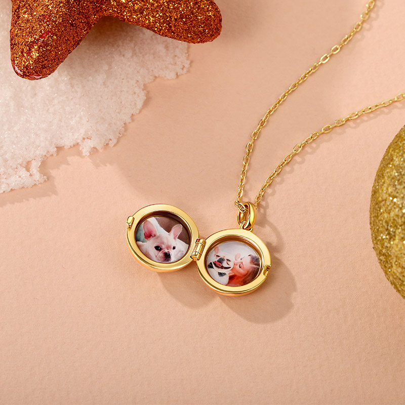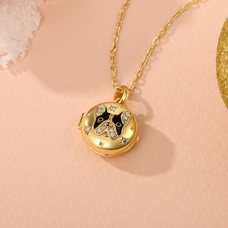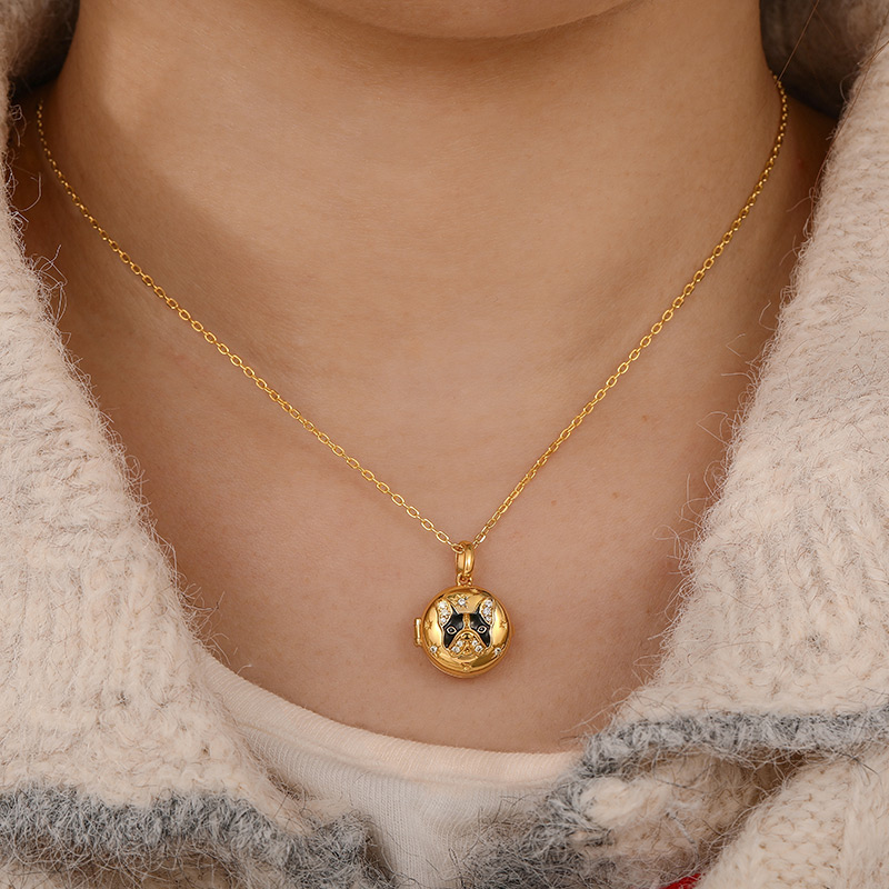 Detta personliga Jeulia guld-graverade fotomedaljong-halsband förenar sömlöst din älskade hunds bild med utsökt smyckeskraft. Den cirkulära pendanten har en dubbelsidig öppningsdesign som tillåter anpassning med ditt hundfoto på båda sidor. Ytter skalet är intrikat graverat med en Fransk Bulldogg-porträtt - svart emalj framhäver de ikoniska fladdermusöronen och ansiktsrynkor, medan vita pave-stenar konturerar den krämiga pälstexturen, omgiven av utspridda sexuddiga stjärnor. Oavsett om det bärs dagligen för att subtilt uttrycka tillgivenhet eller öppnas under speciella stunder för att dela dyrbara minnen, fungerar detta guld-fotomedaljong-halsband som ett värdefullt minne som förbinder dig och din älskade hund.